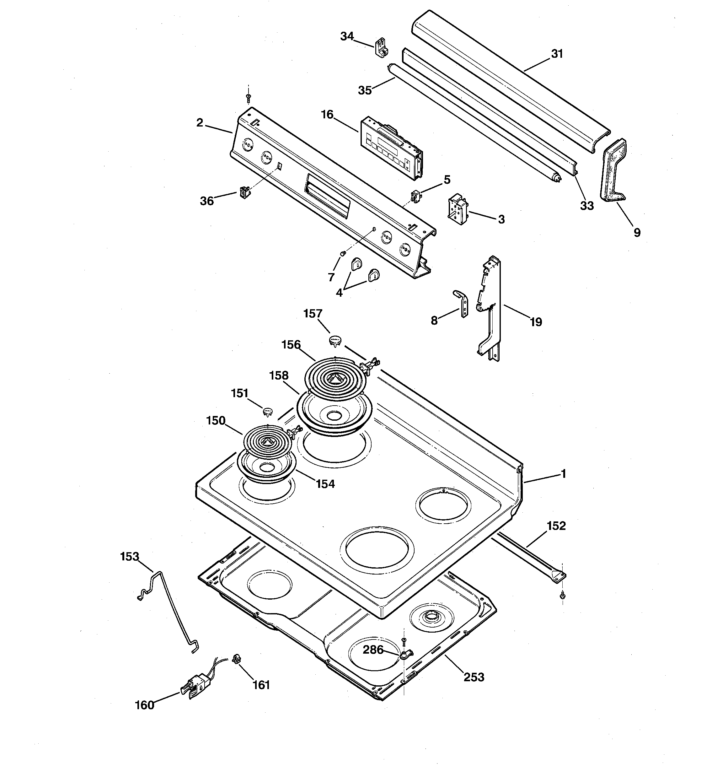 JBP56GR1 Electric Range Control panel & cooktop Parts diagram